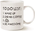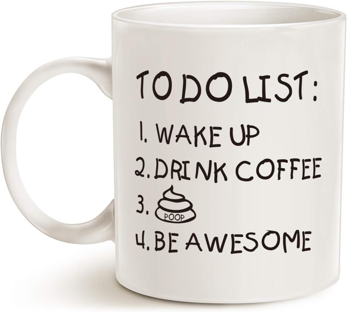MAUAG Christmas Gifts Funny Coffee Mug for Brother Sister Boyfriend, Dishwasher and Microwave Safe. Printed On Both Sides. TO DO LIST: 1.WAKE UP 2.DRINK COFFEE 3.P 4.BE AWESOME design is the perfect gift for family member! High Quality Ceramic, Treat Yourself or Give as a Gift to Someone Special, Can Be Used for Home and Office. Exquisite Fashion, Easy-grip with Handle, Suitable for Hot and Cold Drinks. Great Holiday or Birthday Gift for Your Best Friend, Dad, Mom, Husband, Wife, Grandpa, Grandma, Uncle, Aunt, Brother, Sister, Son, Daughter, Boss, Boyfriend or Girlfriend. They Will Appreciate for Years. MAUAG Mug Inc Designs, Funny Christmas Gifts Mothers Day and Fathers Day Coffee Mug in Natural, 11Oz Capacity. Each mug is microwave & dishwasher safe. The phrase "TO DO LIST: 1.WAKE UP 2.DRINK COFFEE 3.P 4.BE AWESOME" is clearly scripted and centered on the front of the mug. The perfect size to enjoy your morning beverage and the perfect gift for your loved ones on that special day. Ideal to surprise friends or co-workers at the office on any occasion. This product adds to home. Why? Because we like you! Yours today for a very cheap price.