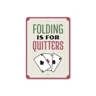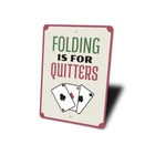 The Lizton Sign Shop Product Description Folding is for Quitters, Playing Cards, Gameroom Sign, Man cave Wall Metal Sign **there may be slight variations in color and text spacing, however your sign will be very similar to the image above. Quality Aluminum Street Signs Sign Information Aluminum Brand New Sign Comes with rounded corners and pre-drilled for easy hanging. We use the highest quality materials - 100% USA-made! Great Gift Idea - Our signs truly make a one of a kind gift. Personalize the sign with the text you want to add. Custom text for the sign can be sent to us via email. A BRAND NEW SIGN!! All of our street signs are made of premium materials. The sign itself is made of aluminum and will never rust providing years of enjoyment indoors and outdoors. No Cheap plastic!! The Lizton Sign Shop specializes in quality personalized custom aluminum signs for any occasion. These make the perfect sign for any man cave, office, basement, garage, college dorm, kids bedroom, game room, bar, pub, tavern or countless other places. *Colors may vary slightly from one computer screen to the next but the image should be very close. All content and designs are subject to copyright and may not be reproduced in any form. Payment Methods We would prefer payment to be made through paypal but we also accept all major credit cards. If you select the credit card option please contact us after you make your purchase and we can walk you through the steps to make a secure payment. Return Policies We will accept returns within 30 days of the purchase date. The buyer is responsible for any costs to return the item or items. Returns will only be accepted for items that were damaged in shipping or if we made an error in the manufacturing of your item, i.e. spelling error.