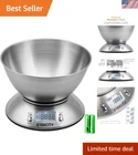 Food Kitchen Scale with Bowl, Digital Weight Scale for Food Ounces and Grams, Cooking and Baking, Timer, and Temperature Sensor, QT, Stainless Steel ๐ฃ๐ฟ๐ฒ๐ฐ๐ถ๐๐ฒ ๐ ๐ฒ๐ฎ๐๐๐ฟ๐ฒ๐บ๐ฒ๐ป๐: 11 lb/5 kg capacity with a division of oz/1 g. High precision strain gauge sensors that deliver trustworthy results every time; LCD display for clear readout in g, kg, oz, lb:oz and โ ๐ฆ๐บ๐ฎ๐ฟ๐ ๐จ๐ป๐ถ๐๐: scale will show at lb:oz/kg automatically when your weight is over 16 oz/1000 g ๐ ๐๐น๐๐ถ๐ณ๐๐ป๐ฐ๐๐ถ๐ผ๐ป๐ฎ๐น: includes room temperature sensor and alarm timer in order to accomplish more tasks with less clutter on the kitchen counter ๐ฆ๐น๐ฒ๐ฒ๐ธ & ๐ฆ๐๐๐ฟ๐ฑ๐: made with stainless steel for a long . Detachable bowl (2. 06QT) for easy mixing and pouring. Sophisticated and modern, fashioned to compliment your kitchen decor ๐๐น๐ฒ๐ฎ๐ฟ ๐ฅ๐ฒ๐๐๐น๐๐: vivid blue backlit display for clear readability in any light setting with low battery and overload indication Simply Accurate - With a weight capacity of 11 pounds (5 kilograms) and graduation of ounces (1 gram), this digital kitchen scale has the accuracy to meet your personal and commercial needs. The compact and lightweight design makes it ideal for homes, kitchens, offices, mailrooms, and more. The scale clearly displays measurement results in g, kg, oz, and lb: oz on the digital LCD display the instant any weight is applied.Removable Bowl Design - The digital scale was designed with a stainless steel detachable bowl, great for measuring mixed ingredients and tare measurements. When not in use, the bowl can be flipped upside down and placed over the scale unit to be used as a protective case, making it easy to store without taking up too much space.Automatic Convenience - Save energy and save time. The zero and tare functions are featured for accuracy when weighing items individually or in containers. After 2 minutes of inactivity, the digital scale will trigger the auto-off function, prolonging the battery lifespan. It also provides low battery and overload indications. Save energy and simplify your life without lifting a finger.SpecificationsWeight Capacity: 1 oz / 1 g-11 lb:oz / 5 kgIncrements: 1 gMeasurement: oz / lb:oz/ g / kgBowl / Storage Size: x x in (L x W x H)Scale Size: x x in (L x W x H)Package Contents1 x Digital Kitchen Scale1 x Stainless Steel Removable bowl2 x AAA batteries(Pre-installed)1 x Quick Start Guide.