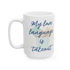 Funny 15oz ceramic mug with the design 'My love language is take out', perfect as a gift for anyone who loves takeout. Ideal for roommates, family members, and coworkers. Fits perfectly into a cozy morning routine or work-from-home setup. Great for birthdays, holidays, or as a thank you gift. Product features - Glossy ceramic finish - Vibrant colors with latest printing techniques - Safe for microwave and dishwasher - Durable white ceramic material - Available in two sizes: 11oz and 15oz Care instructions - Clean in dishwasher or wash by hand with warm water and dish soap