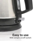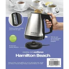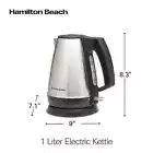 The new Hamilton Beach® Electric Kettle has 1500 watts to heat up to 1 liter of water faster than a microwave and safer than a stovetop. You'll love the convenience of making a quick, hot cup of tea, instant coffee, or hot cocoa without the long wait. This kettle is perfect for hectic mornings or anytime you're in a hurry and need boiling water fast. It's ideal for making ramen, instant oatmeal and grits and for adding boiling water to the pot when making soups, stews and other recipes. The kettle automatically shuts off and has boil-dry protection that prevents scorching. The cordless kettle conveniently lifts off the base to serve hot water at the tabletop or anywhere you're serving hot beverages. Effortlessly monitor the water through the easy-to-view water window. You'll always know how much water is in the kettle or how much you've added when refilling. The kettle is very easy to use with a simple on/off switch, boiling water quickly without any fuss. The electric kettle is BPA free in food zones. The upscale stainless exterior enhances the look of any kitchen and goes well with other appliances and décor, whatever your style. The cord conveniently wraps around the inside of the base to reduce countertop clutter. FASTER THAN A MICROWAVE & SAFER THAN A STOVETOP KETTLE — With 1500 watts, this electric kettle prepares up to 1 liter of hot water fast. Make yourself a quick, hot cup of tea or instant coffee anytime without the long wait — perfect for hectic mornings. AUTO SHUTOFF FOR PEACE OF MIND. The automatic shutoff feature with boil-dry protection keeps the stainless steel electric kettle from scorching. CONVENIENT CORD-FREE SERVING. The cordless electric kettle lifts off the base to serve hot water at the tabletop or anywhere you're serving hot beverages or need boiling water. EFFORTLESSLY MONITOR THE WATER LEVEL: You'll always know how much water is in the Hamilton Beach Electric Kettle or how much you’ve added when refilling, with the easy-to-view water window. EASY TO USE. With a simple on/off switch, this kettle is very easy to use, so you can boil water quickly without any fuss. Hamilton Beach 1 Liter Electric Kettle, Stainless Steel and Black, New, 40901F
