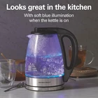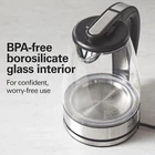 FAST BOILING WITH 1500 WATTS — This glass electric kettle boils up to 1.7 liters of water faster than a microwave and safer than a stovetop kettle. Make a quick cup of tea or French press coffee anytime without the long wait — perfect for hectic mornings. BPA-FREE, BOROSILICATE GLASS INTERIOR: Whether you're boiling water for hot beverages or making a quick batch of instant noodles, the interior is made of BPA-free borosilicate glass walls and a stainless steel heating plate for confident, worry-free use. AUTO SHUTOFF FOR PEACE OF MIND. The Hamilton Beach electric kettle automatically turns off when it reaches a boil. Boil-dry protection keeps the kettle from scorching if water gets low. LOOKS GREAT IN THE KITCHEN: This glass electric kettle looks great on the kitchen countertop. Blue LED lights illuminate when water is heating for a soft blue glow. CONVENIENT CORD-FREE SERVING. The cordless electric kettle lifts off the base to serve hot water at the tabletop or anywhere you're serving hot beverages or need boiling water.