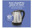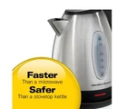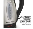 Introducing the Hamilton Beach 1.7-Liter Stainless Steel Electric Kettle, a compact and stylish addition to any kitchen, home office, or dorm room. With its powerful 1500-watt rapid-boil system, this electric kettle can heat up to 1.7 liters of water faster than a microwave and safer than a stovetop kettle. For added safety, the kettle comes with an automatic shutoff feature with boil-dry protection, preventing the unit from overheating or scorching. Monitoring the water level is easy with the two water-level windows, allowing you to see how much water is inside or how much you've added when refilling. The cordless design allows for convenient cord-free serving, making it easy to lift the kettle off the 360-degree rotating base and serve hot water anywhere you need it. The stay-cool handle, push-button lid, and easy-pour spout make filling and serving a breeze. The removable mesh filter prevents mineral scale from getting into your cup, ensuring a clean and enjoyable drinking experience. Whether you're making tea, coffee, or adding boiling water to your favorite recipes, the Hamilton Beach 1.7-Liter Stainless Steel Electric Kettle is the perfect appliance for quick and easy hot beverages.