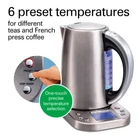 Product details Hamilton Beach Professional Kettle boils water ultra-fast for tea, pour-over coffee, hot chocolate, soups and more. 6 pre-programmed settings, an LCD readout and programmable start time offer maximum control. Variable temperature options six pre-programmed settings bring water to the perfect temperatures, from 160–212ºF, for your favorite hot beverages. When your water is ready, the kettle will automatically shut off. Sleek design stainless steel construction will make this 1.7 liter kettle a countertop mainstay. Interior LED lights in the illuminated water window glow a soft blue, letting you know that hot water is on the way. Easy-to-use controls offer maximum temperature control and programmable start time. An informative, illuminated LCD panel lets you know the current temperature of your water at-a-glance. Easy to clean built-in mesh filter descales water and removes for easy cleaning. Cord-free serving the kettle can be removed from its base and carried anywhere hot water is needed. Convenient cord storage below the base keeps the power cord neatly tucked away. ULTRA-FAST BOILING: Electric kettle heats up to 1.7 liters of water more quickly than the stovetop or microwave. 6 PRESET TEMPERATURES: Are pre-programmed to the ideal temperature for different hot teas, cocoa, pour-over coffee and more, from 160–212ºF. DIGITAL CONTROLS: Make selecting functions simple, while an illuminated LCD panel offers informative readouts including the water’s current temperature. EASY-OPEN LID: Lid opens with the push of a button for one-handed use. CORD-FREE SERVING: Kettle lifts off base, so it can travel anywhere hot water is needed.