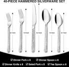 Hammered Silverware Set, 40-Piece Stainless Steel Square Flatware Set for 8, Food-Grade Tableware Cutlery Set, Utensil Sets for Home Restaurant, Mirror Finish, Dishwasher Safe Number of Pieces 40 Material Stainless Steel Color Mirror Finish Product Care Instructions Dishwasher Safe Recommended Uses For Product Indoor Special Feature Rust Resistant Finish Type Polished Included Components 8 Dinner Forks, 8 Salad Forks, 8 Dinner Spoons, 8 Dessert Spoons, 8 Dinner Knives Style Square Hammered About this item PREMIUM 40-PIECE SILVERWARE SET FOR 8: This flatware set contains 8 dinner forks, 8 salad forks, 8 dinner spoons, 8 dessert spoons, 8 dinner knives. It’s the ideal set for home daily use, and also for restaurants, pubs, cafes, and hotels. This cutlery set also help your dinner full of design while having a party. USE AND MAINTENANCE: Recommend hand wash first, storage them after drying. Wire brush, hard sponge, cleaning cloth or any other hard material are not recommend , it will damage the silver. PROPER WEIGHT AND COMFORTABLE HANDLE: The curvature of our utensil handles is designed according to the posture of the hand, and the appropriate weight and perfect balance are added to ensure maximum comfort during use that avoids you feel tired. Moreover, the smooth edges ensure safety and no scratches. ASHIONABLE APPEARANCE - Elegant style with hammered design on the front side of each square handles, Making every meal like a high-end banquet and bring a pleasant dining atmosphere, Matching different tablecloths, The design of the handle can highlight more styles HIGH-QUALITY STAINLESS STEEL: Made of premium food-grade stainless steel, providing the longest term value and the best properties, it offers nice resistance to rust and corrosion to get the most sturdy and healthy experience while using, never bend in daily use.