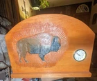 Hand carved buffalo in wood with a battery operated clock. Great for your Mantle. American made, America country, Thanks for looking Oh and clock is 15 in long 11 in tall