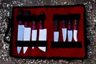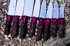 FULL TANG CUSTOM HAND MADE D2 STEEL ENGRAVED BLADE CHEF KNIFE KITCHEN KNIVES SET Wood Handle This superb design knifes is hand made. Blade of this knife has a nice file work and is made of high D2 steel and hardness 55-58 H R C . This robust knife is lab tested under intense conditions, the balance and shape of this knife ensures perfect grip. Overall Pieces : 8 Cleaver Knife : Blade 6" Inches - Handle 4.75" Inches Fillet Knife : Blade 7.25" Inches - Handle 4.75" Inches Chef Knife : Blade 6.5" Inches - Handle 4.75" Inches Paring Knife : Blade 3.5" Inches - Handle 4.5" Inches Steak Knife : Blade 4.5" Inches - Handle 4.5" Inches Sheath : Leather Package Includes: with Sheath Care Instructions: Keep the knife dry after each cleaning. Warning: Take care when removing product from packaging. Keep fingers clear of blades. Store away from children.