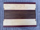 This handcrafted cutting board combines the rich, contrasting tones of black walnut, maple, and purpleheart wood for a striking and functional kitchen piece. -SIZE- L 15.5in W 11.75in H 1.5in All oil and wax used on the cutting boards are food safe and natural. -OIL USED- Bumblechutes woodworkers oil was used. -INGREDIENTS- Coconut Oil, Vitamin E Oil, Mineral Oil, and Lemon Oil. -CONTAINS- Tree Nuts (100% Pure, Fractionated Coconut Oil) -SHOP WAX- Bumblechutes shop wax was used on these cutting boards. -INGREDIENTS- Mineral Oil, Beeswax, Carnuba Wax, Vitamin E Oil, Lemon Oil.