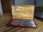 Set of 8 Used J.A. Henckels Solingen 35199-100 No-Stain Serrated Steam Knives. Great condition for their age. Some scratching from normal use. Lots of life left in them! Includes 8 knives and the original storage case.