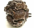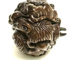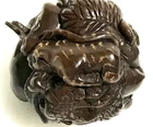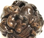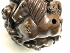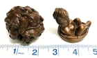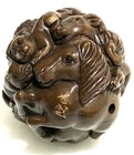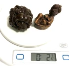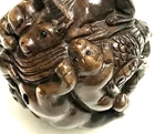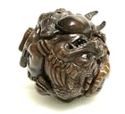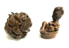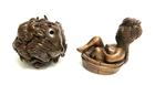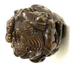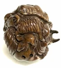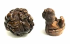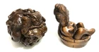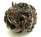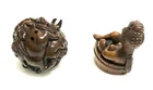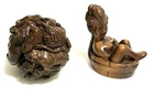 This is a set of 2 Vintage Japanese Netsukes in hand carved boxwood with AMAZING DETAILS. One is a RARE round ball shape with a carved assortment of animals, SIGNED by artist, measures approx. 2" x 2" x 2", in very good condition. The second is a female figure taking a bath naked, SIGNED by artist, measures approx. 2" x 2", in excellent condition. Together they weigh 2.75 oz. I HAVE BRIGHTENED THE EXPOSURE ON THE PICS TO SHOW MORE DETAILS. THEY ARE BOTH A MED/DARK WOOD. PLEASE LOOK AT ALL PICS CAREFULLY FOR DETAILS THAT I CANNOT DESCRIBE WITH WORDS.
