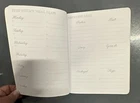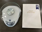 KITCHEN SCALE & STAPLES MEAL PLANNING NOTEBOOK - 60 MEAL PLAN SHEETS - LIKE NEW! The kitchen scale measures 6" by 7" and is in excellent working condition. The planner notebook from Staples is perfect for organizing your weekly meals. It comes with 60 meal plan sheets and is brand new, never used. The notebook has a unit size of 7 1/2" by 5 1/2" and is made of paper. The planner is designed for weekly use and is great for both personal and professional settings. It is a must-have for anyone looking to stay organized and on top of their meal planning. Get yours today and start taking control of your weekly meals! ** There is a slight water mark on the front cover (as seen in photo) - it is only on the outside cover and is faint but visible. Book is otherwise in excellent condition with no writing inside.