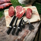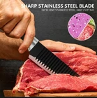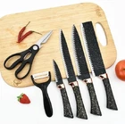 KNIFE SET PACK OF 6 STAINLESS STEEL EXCELENT QUALITY BEST USE FOR HOME KITCHENS Certainly, here are five product highlights for the 6-Piece Knife Set: 1. **Exceptional Durability:** Crafted with precision, these knives are built to last, ensuring they remain reliable kitchen tools for years. 2. **Non-Stick Operation:** The innovative groove ripple blade surface design guarantees a non-stick cutting experience, making meal preparation effortless. 3. **Ergonomic Handle:** Each knife is designed with an ergonomic non-slip handle, providing a perfect balance that allows for precise and comfortable control. 4. **Versatile Set:** This set includes a Ceramic Peeler, Scissor, Cleaver Knife, Santoku Knife, Paring Knife, and Chef Knife, covering all your kitchen needs. 5. **Luxurious Gift Box:** The knives come elegantly presented in a luxurious gift box, making them an ideal and impressive gift for any cooking enthusiast or a beautiful addition to your kitchen. "Experience culinary excellence with our 6-Piece Knife Set, elegantly presented in a luxurious gift box. Crafted with the utmost precision, each knife embodies high-quality construction for exceptional durability, ensuring they will be your kitchen companions for years to come. The innovative groove ripple blade design guarantees a non-stick cutting experience, while the ergonomic, non-slip handles provide impeccable balance and effortless control. This set includes a Ceramic Peeler, Scissor, Cleaver Knife, Santoku Knife, Paring Knife, and Chef Knife – everything you need for versatile and efficient meal preparation. Elevate your culinary journey with this exquisite Knife Set, the perfect gift for any food enthusiast." How to care for your new knives: ~ Store in a dry place, moisture encourages rust. Damascus is very easy to clean if rusted but is rust resistant. ~ After use, wash and dry the blade & apply vegetable oil, or any food safe lubricating oil. ~ To maintain a beautiful finish, clean the brass on the handle with a brass cleaner (e.g Brasso). ~ Sometimes Damascus steel darkens with age. To brighten up the blade, sand it lengthwise with a worn piece of sand paper. This just hits the raised portions of the etched pattern and makes the blade look brighter