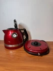 The KitchenAid Pro Line Electric Kettle in Candy Apple Red is a used appliance with a 1.5 liter capacity and 110V voltage. It is a KitchenAid brand electric kettle that weighs 5.48 pounds and has a model number of KEK1522CA. The kettle has a candy apple red color and a size of 1.6-qt. It is suitable for use in the kitchen and dining area, and is ideal for making tea.