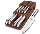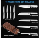 LONG LASTING SHARP: imarku kitchen knife set adopts high-quality Japan High Carbon Stainless Steel to achieve durable sharpness, hand sharpened by experienced artisans for outstanding cutting performance. The ultra-sharp knife has a 15° angle per side of the blade and a very thin blade thickness of 2.25mm. A premium chef knife set for professional kitchens & home chefs, strong, durable, and corrosion-proof PATENTED DESIGN HANDLE: This Japanese knife set has a patented handle design. The handle is etched with non-slip grooves to increase friction. Perfectly engineered to add aesthetics while maximizing grip comfort. Easy to hold and well-balanced, without hand fatigue, all these features embody the good quality of the knife set, making this knife sets for kitchen with block favored by many cooking enthusiasts EASY STORAGE&CARE: The knives set for kitchen comes with a wooden knife drawer organizer which is fine hand polished for a beautiful look and good textured. You can place this knife block set on the counter or in a drawer, easily storing all the knives. The top of the knife holder is hollowed out to help disperse moisture. It is a great organizer to save space and reduce the possibility of knives rusting VALUE PACK: Our knife set with block includes 1* 8" Chef Knife, 1* 8" Slicing Knife, 1* 8" Bread Knife, 1* 7" Santoku Knife, 1* 6" Boning Knife, 4.5" Steak Knife Set of 4, 1* knife block. The integrated design of the kitchen knife set with an in-drawer knife block will fancy you. Dishwasher Safe knives! But still highly recommend wiping all the knives dry after cleaning for better maintenance and long-lasting use WONDERFUL GIFT: imarku knife set focuses on improving quality to enhance your cooking experience and make cooks easier. imarku has a top-notch guarantee service that promises permanent coverage against defects. If you're looking for Father's Day Gifts, Valentine's Day gifts, birthday gifts, wedding gifts, and housewarming gifts, this kitchen knife sets with block is worthy of your choice