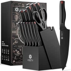 Decent Kitchen Knife Set: The sleek black finish of this knife set adds an element of sophistication, enhancing the aesthetic of any kitchen decor. Presented in an elegant box, it's a great choice for vavious special occssions for you or your loved Knife Set with Block: Includes 8" chef's knife, 8" bread knife, 8" slicing knife, 7" santoku knife, 5" utility knife, 3.5" paring knife, 6 pcs 4.5" serrated steak knives, kitchen shears, and hardwood knife block with built-in sharpener. Meet all your kitchen needs! Sharp Knife Set: Razor-sharp out of the box with a 15-degree hand-polished edge per side. Precision-forged from high-quality stainless steel, these blades are rust-resistant and maintain long-lasting sharpness. Ideal for slicing, cutting, and dicing Easy to Use: The ergonomic design offers a comfortable grip, reducing wrist fatigue during long cooking sessions.This kitchen knife set features a built-in sharpener, making it even more convenient. Always keep all your knives in their optimal condition Dishwasher Safe: The black coating protects against corrosion and wear, ensuring the knife set stay new and perform well over time. These knives are dishwasher safe for added convenience. We offer 24/7 customer support for any questions