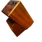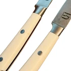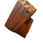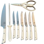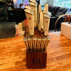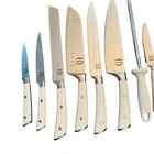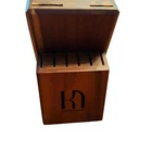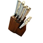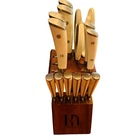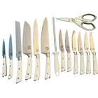 KnifeSaga's 15 Piece Knife Set features high carbon stainless steel blades for precision and accuracy. Comes with a knife block and a sharpener for easy maintenance and storage. • High carbon stainless steel • 15 piece set includes: chef's knife, slicing knife, bread knife, utility knife, paring knife, steak knives, and kitchen shears • Comes with a knife block • Includes a sharpener for easy maintenance Condition: Pre-Owned Good Looks gently used Small cracking on two handles see photos.