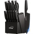 【HIGH-CARBON Steel & Built-in Sharpener for Sharpness】:Crafted from high-grade stainless steel, our kitchen knife set is expertly designed to withstand rust and corrosion, ensuring that your knives maintain their sharpness and pristine appearance over time. This will be the last set of kitchen knife you will ever need. 【Comfortable Grip and Anti-Slip Handle】: Designed with ergonomics in mind, our knife block set is equipped with user-friendly handles that provide a comfortable and secure grip during use. The thoughtful design of the handles enhances the overall cutting experience, making cooking experience a breeze. 【All-in-One Knife Set for Organized Storage】: 15 pieces knife set includes: 8" Chef knife, 8" Slicing knife, 7" Santoku knife, 8" Serrated bread knife, 5" Utility knife, 3.5" Paring knife, 6 Pcs 4.5" serrated steak knife, 1 Pcs kitchen shear, and Black hard wood knife block with built-in knife sharpener. This block enhances safety by reducing the risk of accidents and wear. It also ensures quick and easy access to the right knife, streamlining your kitchen workflow. 【Efficient Cleaning with Dishwasher Safe】: Simply place knives in the dishwasher after use, and let the machine take care of the cleaning process. 【Perfect Gift and Lifetime Warranty】: Our knife set for kitchen is the perfect gift choice for Housewarming, Valentine's Day, Wedding, Birthday, Thanksgiving, Halloween, Christmas. Additionally, our steak knives come with a lifetime warranty that guarantees quality and performance, providing you with peace of mind.