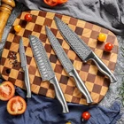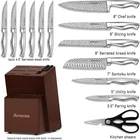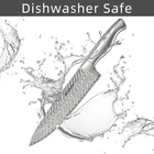 【Premium knife sets for kitchen with block】 Ultra sharp, full tang, rust resistant technology, German 1.4116 stainless steel. Outstanding craftsmanship, cutting edge technology, stunning design, and superior materials. This is not only the best choice for professional kitchen or home use, but also the highest grade for gifts. Tip: The pattern on the blade is not a damascus pattern, it is a laser pattern. 【Dishwasher Safe】 Each knife is dishwasher tested 999 times. Exclusive patented anti-rust technology ensures that they remain in the best condition after intense rinsing in the dishwasher.Enjoy the pleasure of cooking and then easily restore your kitchen to a tidy state. 【All in One Value Knife Set】 15 pieces Damascus knife set includes: 8" Chef knife, 8" Slicing knife, 7" Santoku knife, 8" Serrated bread knife, 5" Utility knife, 3.5" Paring knife, 6 Pcs 4.5" serrated steak knife, 1 Pc kitchen shear, and Premium Acacia Wood Knife Block with built-in Knife Sharpener. 【Comfortable and safe handle】 Ergonomic knife handle that perfectly fits any hand shape, designed by the most professional designers. Whether you use it left-handed or right-handed, whether your hand is big or small, holding this knife, you can feel the smoothness and comfort that you hav