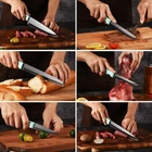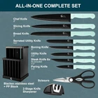 Knife Set, 15-Piece Kitchen Knife Set with Block Wooden German Stainless Steel. Item Description: 【ALL-IN-ONE KNIFE SET】 This 16-piece kitchen gadgets set includes 13 professional chef knives, kitchen scissors, a premium quality 2-stage knife sharpener, and a steel knife block. You will discover that cooking becomes an enjoyable experience! 【FOOD-GRADE CARBON-BASED COATING】The knife's surface features a high-polymer precision coating that resists stains and pitting. The ergonomically designed serrated steak knife excels in meat cutting. It prevents water erosion, rust, and is dishwasher safe. 【SUPERIOR KNIFE QUALITY】Crafted from German high-carbon stainless steel with hand-polished edges, precision tempering, superior materials, and advanced technology, these blades attain exceptional sharpness and lasting sturdiness. 【WHY CHOOSE CuCut? 】Our steel knife block showcases our new 2023 patented design with a vertical suspension, optimizing space utilization beyond the ordinary. A genuine cutlery organizer! It comes with a magnetic sharpener and universal scissors.