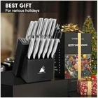 Knife Set, 15-Piece Kitchen Knife Set with Block Wooden German Stainless Steel Description:- SHARP AND DURABLE: Our knives set are crafted from high-carbon stainless steel with a Rockwell Hardness (HRC) of up to 58, allowing them to handle a variety of ingredients with ease while maintaining their sharp edge over time. SUPERIOR RUST RESISTANCE: Our knives have undergone rigorous salt spray testing, ensuring excellent rust resistance and corrosion protection, so they remain pristine and shiny even after extended use. ERGONOMICALLY DESIGNED HANDLE: The handle of knife is meticulously crafted to fit the contours of the hand, with added weight for a comfortable grip, making it easy to use for extended periods without fatigue. CONVENIENT ACCESSORIES: The knife block comes with a built-in sharpener for hassle-free maintenance, and the set also includes a versatile pair of kitchen shears, perfect for cracking nuts and opening bottle caps. ALL-IN-ONE KITCHEN SET: Our Knife Set include 6 pcs 4.5" steak knives, 8" chef knife, 8" slicing knife, 8" bread knife, 7" santoku knife, 5" utility knife, 3.5" paring knife, 1 kitchen shears and a hardwood knife base with built-in sharpener. SATISFYING GIFT: The knife set come beautifully packaged in a stunning box, making them the ideal gift for cooking enthusiasts. Perfectly combining practicality with elegant design, they are sure to be cherished by any chef.