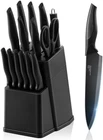Knife Set, 15-Piece Kitchen Knife Set with Block Wooden German Stainless Steel Description:- ALL-IN-ONE KITCHEN SET: Includes 8" Chef Knife, 8" Bread Knife, 8" Slicing Knife, 7" Santoku Knife, 5"Utility Knife, 4.5" Steak Knife x 6, 3.5" Paring Knife, Shears, Sharpener and Knife Block, This kitchen knife set can meet the needs of various cutting tools needed by professional chefs or home chefs when cooking HIGH CARBON STAINLRSS STEEL: This set of knives is made of premium quality high-carbon stainless steel, Black non-stick coating prevents steel from oxidation and is easy to clean, Hand washing is recommended to extend the service life, High-hardness blades with razor-like sharp edges for more precise cutting and trimming will help you easily solve every cutting task in the kitchen COMFORTABLE HANDLE: The handle of the knife set is ergonomically designed and the weight and curvature of the handle are just right, The curved handle achieves the optimal grip and comfort during use, It can be held well so that the handle will no longer loosen or fall off, Making it easy to use and giving you a good experience MULTI-FUNCTIONAL KNIVES SET: This 15-piece versatile knife set is suitable for kitchen, restaurant, outdoor camping trip or picnic, Widely used for cutting, slicing, shearing, shredding, dicing, boning and carving, Such as easy to cut tomatoes, cut onions, cut carrots, cut steak and bone a chicken, And is also a good choice to give to friends for housewarming EASY TO STORE: The black knife block is designed with a slot of the appropriate size, Put it into the knife block after use, Which can reduce the risk of accidental damage of the blade and avoid hurting the chef, And also make your kitchen look neat, The knife set includes a sharpener that sharpens the knife regularly to keep the knife sharp (tip: Clean and keep it dry before storing)
