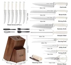 About this item 🔪 High Quality Stainless Steel Kitchen Knife Set: Knife Set are made from X50Cr15 German superior high-Carbon stainless steel blades for precision and accuracy. well resisted against corrosion and oxidation, safe, durable, easy to sharpen and maintain its shininess. 🔪 18-piece Kitchen Knife Set: Our Off White Knife Set is with all-in one complete set which include Chef Knife,Santoku Knife, Utility Knife,Bread Cutter,Slicing Knife, Steak Knivies, Paring Knife, Scissors, Knife Sharpener .This Knife Set is well equipped to meet all your basic need. 🔪 Easy Care and Clean: Full Tang Design and not easy to rust, stains or pitting. Our Knives store safely in the natural hard wood block.This knife block is also with built-in sharpener which is very convenient for handy sharpening and can save storage space. Please don't use in a dishwasher,hand washing is recommended to retain the fine quality of the exceptional blade. 🔪Best Kitchen Cutlery Set : Rust-resistant high-carbon stainless steel blades is forged with hand-polished edges and precise tempering which ensure the blades retain their ultra-sharp edge longer than conventional stainless steel .The ergonomically designed handle provides comfort and confidence in handling.