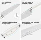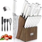 23PCS Knife Set Includes: 1x chef's knife---------1x santoku knife 1x bread knife---------1x slicing knife 1x utility knife---------1x paring knife 1x boning knife---------8x steak knives 1x sharpener rod---------1x kitchen shears 1x finger guard---------1x egg whisk 1x spreader spatula---------1x flexible spatula 1x basting brush---------1x user's manual Features: Material: German High-Carbon Stainless-Steel blade made of X50CrMov15 steel Triple Rivet Polymer and Ergonomic handle for pleasant grip, also non-slip Extraordinary One-Piece Design ,safe and durable Perfect gift for Wedding, Birthday, Housewarming, Thanksgiving, Christmas Ultra-Sharp Edge The edge of every knife is painstakingly hand sharpened to 14-16° per side, maintaining the perfect balance between achieving ultra thin slices and maximum resilience. Quality High-Carbon Stainless Steel All knives’ blade are forged from X50CR15 German Superior high-Carbon stainless steel with exceptional corrosion resistance and oxidation resistance. Hard,durable and rust-resistant. Triple Rivet Polymer and Ergonomic handle Full tang handle with triple riveted design ensures the maximum comfort and precision while cutting, sturdiness and durability. Knife Sharpener Keeping your quality knives in excellent condition, will really enhance your chef capabilities. 3-IN-1 Multifunction Kitchen Shears Kitchen shear is a multi-purpose tool in kitchen that you must have. You can use it to cut chicken or vegetables, nut carcker, as a bottle opener . Knife Block The wood block made from natural oak wood which is safe and unscented. Block bottom features anti-slip plug base for non-slip use on counters. Organize and store your cutlery to keeps your kitchen clean and orderly.