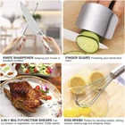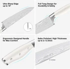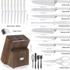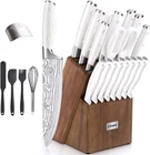 Knife Set, 23 PCS Kitchen Knife Set with Block, Germany High Carbon Stainless Steel Chef Knife Block Set, Knives Set for Kitchen with Sharpener & Finger Guard, Ultra Sharp, White [Professional All-in-One Kitchen Knife Set]: Our knife set includes: chef knife, bread knife, slicing knife, santoku knife, boning knife, utility knife, paring knife, 8 pcs steak knives, knife sharpener, kitchen shears, finger guard, acacia wooden block, and other accessories. All these knives are suitable for all kinds of needs on your kitchen. [High Quality Material and Superior Sharp]: All knives’ blade are forged from X50Cr15 German Superior high-Carbon stainless steel with exceptional corrosion resistance and oxidation resistance. Strong, sturdy bolster for perfect stability and control. Each knife edges hand-polished to 16-18°per side, make the knives extra sharp, sturdy & practical. [Ergonomic Handle & Unique Pattern]: The ergonomically designed handle provides comfort and confidence in handling, sturdiness and durability, especially during prolonged usage. The blade features with unique damascus pattern, which make it has a attractive appearance. A perfect mix of design & practicality! The triple-riveted construction of the handle can secures handle with the blade and makes sure the knife doesn’t slip off from the middle. [Easy to Care & Storage]: All knives are well organized into a beautiful acacia wooden block,which could be a perfect kitchen decor while reducing the risk of rusting .Wash them by hand and dry them by soft cloth immediately after each use will help to keep sharp and extend the service life.(Dishwasher is not recommended) [Premium Support]: Every knife is sharp, sturdy & practical. No rust, stains or pitting. We are committed to improving your cooking experience. It's our responsibility to guarantee the quality of products. If you’re not satisfied with our knife set, please feel free to contact us at any time. We wish that our customer have 100% good shopping experience.