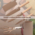 【Professional High Quality Chef Knife Set】The Coffee 6-Piece Knife Set with superior high-carbon German stainless steel blades for precision is sharp and sturdy with a thin edge that keeps food from sticking to the knife’s edge, maintaining its ultra-sharp edge for precise cuts. Honed for long-lasting sharpness, the fine-edge blades boast precision cutting. Please stay away from Children because it is very sharp. 【Utility-driven Kitchen Knife Set】The 6-piece professional chef knife block set meets all the tools you need: 12" Kitchen Knife, 10" Chef's Knife, 9" Utility Knife, 8" Small Cleaver Meat Knife, 7.9" Kitchen Scissors, 9.3" Universal Knife Block. Multi-purpose Shear. Kitchen Knife Sets keep knives organized, neat, and space-saving. 【Ergonomic Design - Comfortable and Durable Handle】The appearance of this handle is made of wood grain design, each knife in the kitchen knife set features a fully forged bolster for sturdy, balanced cutting. The solid ergonomic PP wood handles enhanced Comfort Level and minimize wrist tension, give you a good sense of control over the blade and even after prolonged use, your palm and wrist will not fatigue. 【Nonstick & Rustproof Kitchen Knife Set】Unique Blade Design - Classic 3cr13 + Diamond Blade + Non Stick Coating, special new upgraded diamond pattern non stick coating kitchen knives are not only particularly but also strikingly, coating with nonstick coating can prevent food from sticking to knives and effectively prevent knives from rusting and very easy to clean. 【Gift Ideas and 100% Customer Satisfication Service】Knife block set is ideal for both professional and amateur cooks, this 6 pieces kitchen knife set is very suitable for parents and friends on Father's Day, Mother's Day, as a housewarming gifts, thanksgiving gifts and Christmas gifts. For any problems, please do not hesitate to contact us. promises hassle-free replacement or return of defective knife sets.