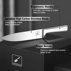 About this item ULTRA SHARP KNIFE SET - Professional fine tempering process on Japanese stainless steel achieves optimum sharpness and long-lasting razor edge retention. Superb cutting performance of sharp knife set ensures precise but effortless slicing, dicing and chopping on any food prep. Enjoy cooking, more fun EXCELLENT QUALITY KNIFE SET WITH BLOCK - Kitchen knife set is made of high carbon stainless steel with outstanding resistance to rust, corrosion and discoloration. Knife block adopts premium solid wood with finely coating for higher reliability and sleek looking. Quality knife brings you an efficient and class life UNIQUE ERGONOMIC DESIGN - Unibody one-piece stainless steel bold-end handle for great balance, grip and durability, better than separated handles that is easy to hide filth or even crack. Plus the wider finger bolster for extra control, full tang kitchen knife is so comfortable to hold that you can cut easier, safer and faster EASY CARE & STORE - 15 Pcs value kitchen knife set includes: chef knife, santoku knife, bread knife, slicing knife, utility knife, paring knife, multi-purpose shears, serrated steak knife set of 6, knife sharpener and block. Kitchen knife set is well organized in wood knife block, keep tidy and space-saving. Tips: Kitchen knife set is Dishwasher Safe, yet hand washing is better for longer sharpness and lifespan! ( Please wipe off the water after cleaning & place in dry, ventilated place)