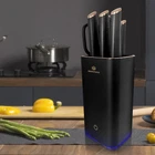 Smart Cleaning: The interior of the knife holder has a cleaning and drying function, waterproof and rust-proof. Wash the knife and put it back on the knife holder and press the button, the base will turn on breathing light and start working. The light goes off after five minutes, after fifteen minutes the cleaning job is over. The knives will become clean and dry. High-quality blade material: Forged with high-quality German stainless steel, the blade is added with molybdenum vanadium material, which makes the hardness and toughness more excellent. The surface of the blade has an anti-rust coating, which is not easy to rust and has a longer service life. Knife sets that meet various needs: Compared with complex and diverse knife sets, simple configurations can express clear functions. The set includes santoku knife, Utility knife, serrated bread knife, chef knife, and kitchen shears. This kitchen shears can be a bottle opener. Built-in sharpening rod keeps each knife sharp. The knife holder storage box is small and exquisite, convenient for placement and storage. The 5Cr15mov blade is durable, non-stick and anti-rust. Ergonomic handle design provides a comfortable grip Kitchen life is more intelligent: the set has a simple and elegant appearance whether it is outdoor picnic or as a holiday gift, it is a good choice. Make your kitchen life more intelligent, cleaner and high-end.