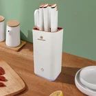 Smart Cleaning: The interior of the knife holder has a cleaning and drying function, waterproof and rust-proof. Wash the knife and put it back on the knife holder and press the button, the base will turn on breathing light and start working. The light goes off after five minutes, after fifteen minutes the cleaning job is over. The knives will become clean and dry. High-quality blade material: Forged with high-quality German stainless steel, the blade is added with molybdenum vanadium material, which makes the hardness and toughness more excellent. The surface of the blade has an anti-rust coating, which is not easy to rust and has a longer service life. Knife sets that meet various needs: Compared with complex and diverse knife sets, simple configurations can express clear functions. The set includes santoku knife, Utility knife, serrated bread knife, chef knife, and kitchen shears. This kitchen shears can be a bottle opener. Built-in sharpening rod keeps each knife sharp. The knife holder storage box is small and exquisite, convenient for placement and storage. The 5Cr15mov blade is durable, non-stick and anti-rust. Ergonomic handle design provides a comfortable grip Kitchen life is more intelligent: the set has a simple and elegant appearance whether it is outdoor picnic or as a holiday gift, it is a good choice. Make your kitchen life more intelligent, cleaner and high-end.