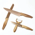Knife Set - Luxury rose Gold kitchen Knife set, titanium coated 4 piece stainless steel hollow handle golden kitchen knife set wood grain knife Product Details Blade Material: Stainless Steel Brand: MAOMIDA Color: Rose gold wood grain Handle Material: Resin,Stainless,Stainless Steel,Steel,Wood Blade Edge: Serrated Handle Material: Resin,Stainless,Stainless Steel,Steel,Wood Is the item dishwasher safe?: No Blade Material: Stainless Steel Item Length: 9 Inches BladeLength: 25 Centimeters UPC: 614161523997 Brand Name: MAOMIDA Manufacturer: MAOMIDA Blade Color: 轻奢金 Color: Rose gold wood grain Construction Type: Forged BladeType: Serrated Stick resistant: Each blade is crafted from stainless steel and features a stick resistant, resin coating that limits food from adhering to the knife; this allows for easier, more efficient cutting Best knife set outstanding Performance The knives are single piece made, easy to hand clean and no more loose or fallen handle. Optimized weight and good balance make kitchen knives fit nicely in the palm of hand. The hollow handles are ergonomically designed to provide comfort and perfect grip. Perfect for both professional and beginner. Slice like a dream: If you think our 4-piece cutlery set is pretty, wait until you slice it with these delicate knives. These knives are made from some of the finest, highest quality materials and can be sliced and diced in any food you throw at them. Sourced from stainless steel with a spray black titanium coating, these knives for chefs and home cooks are super sharp and will keep the edge of their razor life for a long time. Skilfully designed blades with a durable stainless steel construction for effortlessly cutting Reinforced wood grain handle for comfortable grip and easy control during use. Made in China.