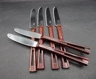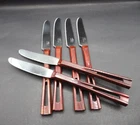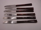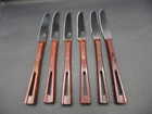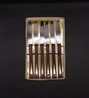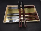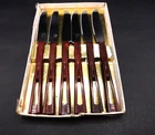 Upgrade your kitchen cutlery with this premium set of 4 steak knives from Stanley, and 2 knifes marked stainless only, a total of 6 . Crafted from high-quality stainless steel, these knives are expertly designed for effortless slicing and dicing. The brown lucite handles provide a comfortable grip, while the sleek and stylish design makes them the perfect addition to any dinner table. 4 of the knifes are marked Stanley Stainless and 2 of the knifes blades are designed different and marked with only stainless. The box the knifes are in is very old and does not have a top, so I will not send it unless you want it. Thank you for shopping B's Shoppe Inv. # P32-B6