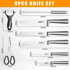 Knife Set, Professional Stainless Steel Chef Knife Set of 9 with Rotatable Acrylic Stand for Kitchen, Ergonomic Ultra Sharp Non-Stick Kitchen Knife set with Gift Box for Women Gifts Product Details Color: Silver Brand: Cokinutvalleyus Blade Material: Stainless Steel Blade Edge: Straight Item dimensions L x W x H: 6 x 4 x 4 inches Color: Silver Brand: Cokinutvalleyus Blade Material: Stainless Steel Blade Edge: Straight Item dimensions L x W x H: 6 x 4 x 4 inches Style: Modern Item Weight: 0.5 Pounds Is Dishwasher Safe: No Construction Type: Forged Manufacturer: Cokinutvalleyus Product Dimensions: 6 x 4 x 4 inches Item Weight: 8 ounces Date First Available: March 24, 2024 9 Piece knife set:The set with gift box includes chef knife, japanese kitchen knife, universal knife, fruit knife, knife sharpener, peeler, scissors and knife holder. Perfect for Valentine's Day, Mother's Day, Christmas, Thanksgiving, birthday gifts, etc Excellent material:The kitchen knife is made of stainless steel, which has hardness, toughness and sharpness, and is not easy to break and deform. Excellent workmanship, suitable for long-term use. It is safer to use without rusting Ergonomic handle:This chef's knife set is designed with a hollow handle, and the handle of the tough stainless steel multi-round grinding is not deformed. Exquisite workmanship, ergonomic curve, easy grip, reduce hand fatigue Sharp blade:The blade of a professional kitchen knife is made of high-carbon stainless steel, with a V-shaped 15-degree cutting edge design, which is sharp and durable. Craftsmanship makes the blade surface more wear-resistant Easy to clean and care:My professional knife set is super easy to clean. One-piece stainless steel material is not easy to hide dirt and practices. After use, you only need to clean these knives with water and dry them with a towel to maintain the excellent quality of the blades Professional stainless steel kitchen knife set of 9, with beautiful appearance and excellent workmanship. This set allows each knife to have a division of labor, making it safer and more hygienic to use separately. The acrylic knife holder is easy to store and keeps the kitchen organized. Features: Stainless steel, concave process design, non-stick knife for meat cutting Ergonomic, long-term grip without getting tired Sharp blade, good steel is used on the blade The knife holder is stored without taking up space Specifications: Material: Stainless steel Color: Silver Style: Modern Simple Function: Chopping vegetables, meat, fruit, peeling Chef knife size: 34 x 4.5cm Japanese chef knife size: 32 x 4.5cm Bread knife size: 34 x 3cm Universal knife size: 24 x 2.2cm Fruit knife size: 20 x 2.2cm Knife sharpener size: 30 x 3.5cm Peeler size: 13 x 8cm Scissors size: 18.5 x 7.5cm Acrylic Knife holder size: 23 x 15cm Weight: 1.39kg Packages Included: 1x Chef knife 1x Japanese chef knife 1x Bread knife 1x Universal knife 1x Fruit knife 1x Knife sharpener 1x Peeler 1x Scissors 1x Acrylic Knife holder
