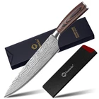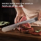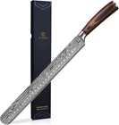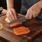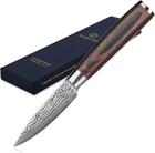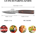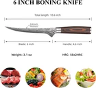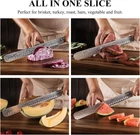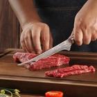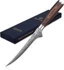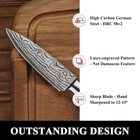 Brand Sunnecko® As a professional kitchen knife manufacturer since 2002, we have our own factory for the production and we promise good quality for the kitchen use. We could give you the best price and the best services for the business. Each parcel will have a tracking number when shipped, and we will help to track until you get it successfully. Please shop in our store without any worry! Product Description 【Premium High Carbon Stainless Steel】 Constructed from high carbon German EN1.4116 stainless steel,this 5.5 inch utility knife contains 1–1.2% carbon,with a HRV of 58±2, provides increased rigidity and sturdiness. Laser-engraved pattern ( Not Damascus Pattern ) on the blade surface, looks elegant and keeps food from sticking to the knife while cutting. 【Ultra Sharp Knife】 Hand sharpened and honed precisely at 15°per side,the knife blade tapered from the spine to the cutting edge, and ensure a effortless precision while cutting. The superb alloy prevents the cooking knife from dulling and rusting, maintaining its original sharpness over time. 【Ergonomically Wooden Handle】 The blade of this chef knife is integrated with a soft Pakkawood anti-slip handle, ensuring comfortable grip for any hand sizes. Ergonomic design and well balance between weight and size of the knife greatly reduces wrist tension. Achieve the best cut without tiring our hand or wrist. 【Great Gift Box with PVC Knife Sheath】 The Japanese chef knife comes with a knife edge guard which provides a well protection for the blade and convenience for taking the knife outside for party or camping. 【All-purpose】 The professional chef knife can handle 99% of your daily kitchen tasks such as cutting, slicing, chopping, mincing and dicing of fruits, vegetables and all kind of meat. Sunnecko always focus on providing healthy and premium kitchen knife for our customers. We have 60-day money back policy, free replacement, one year guarantee and the most satisfactory solution.Try Sunnecko chef's knife without concern! Photo Show 12 Inch Slicing Knife: 8 Inch Chef Knife: 6 Inch Boning Knife: 5.5 Inch Utility Knife: 3.5 Inch Paring Knife: Package Included 1 x 12 Inch Slicing Knife with Sheath 1 x 8 Inch Chef Knife with Sheath 1 x 6 Inch Boning Knife with Sheath 1 x 5.5 Inch Utility Knife with Sheath 1 x 3.5 Inch Paring Knife with Sheath 1 x Gift Box (Packed well with our unique box for safe shipment, should be a best present choice for the holidays, weddings, parties, family and friends!)