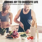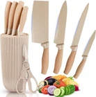 Product Description 🌿【PROFESSIONAL HIGH QUALITY ESSENTIAL KITCHEN KNIFE SET】The Kitchen Knife Set with premium high carbon stainless steel material applied to the blades ensures these knives have good edge retention, and unparalleled toughness. Meanwhile, Each blade of knife set is painstakingly and precisely polished by expert craftsmen to ensure maximum sharpness. 🍒【NONSTICK & RUSTPROOF KITCHEN KNIFE SET】 Kitchen knife set features a Unique star texture Blade Design, that is looks fashionable and exquisite. Simultaneously knife set adopting upgraded coating with nonstick can prevent food from sticking to knives and effectively prevent knives from rusting and very easy to clean. 🍓【COMFORTABLE & SAFE HANDLE】 Ergonomic knife handle that perfectly fits any hand shape, designed by the most professional designers. Whether you use kitchen knife set left-handed or right-handed, whether your hand is big or small, holding this knife, you can feel the smoothness and comfort that you have never felt before! 🥦【PRACTICAL KITCHEN KNIFE SET WITH BLOCK】The 6 Pcs Knives set with knife block includes 7" Larger Cleaver, 8" Chef Knife, 8" Slicer Knife, 5" Utility Knife, Kitchen Scissors, 9.3" Universal Knife Block. Kitchen Knife Set can help you easily cut meat, fish, vegetables, fruits, etc. The practical kitchen essential knives give you a good cooking experience. 🥝【EXQUISITE & CONVENIENT KNIFE SET BLOCK 】This kitchen knife block Adopting the latest fashionable stripe design, unique and beautiful in shape, They will help you do all your kitchen cutting smoothly and the knife storage can keep your knife set together for easy access and create a tidy countertop space. Tips: The round block is detachable for cleaning. 8” Kitchen Knife Medium thickness, suitable for meat, vegetables, fruits and so on. 8” Carving Knife Intended for cutting smaller and thinner slices of meat and fish, cut sashimi. 7” Chef Knife The Universal Chef Knife features a curved blade design that cuts through meat and vegetables with ease. Scissors Multi functional household scissors. A must-have tool in the kitchen that can cut meat and vegetables. Also used to open bottles and nuts. Utility Knife The Utility Knife has a small volume and light weight, suitable for cutting and peeling various vegetables and fruits. Round Knife Storage The Round Knife Storage will help you do all your kitchen cutting smoothly and the knife storage can keep your tools together for easy access and create a tidy countertop space. Tips: The round block is detachable for cleaning. MARBLE GRAIN BLADE The Revolutionary Advanced Antioxidant Marble Pattern Non Stick Coating Technology, Can Come Into Direct Contact With Food. ERGONOMIC DESIGN Crafted For Optimum Comfort, Contorl, And Agility