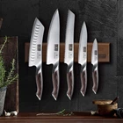 About this item 【Professional Knife Set】The HOSHANHO 6-piece knife holder set includes all the knives you need for cooking: 8" Chef knife, 8" Serrated bread knife, 7" Santoku knife, 6" Utility knife, 3.75" Paring knife, and a double-sided magnetic knife holder. Multifunctional, multipurpose. 【Powerful Magnetic Knife Holder】The whole knife holder is embedded with magnetic core, strong magnet makes the suction stronger to hold knives or other ferromagnetic tools. The whole is made of natural acacia wood, making knife contact safer and more beautiful. 【Sharp Cooking Knife】Every HOSHANHO kitchen knife is forged from AUS-10 high carbon stainless steel for excellent resistance to stains, rust and corrosion. The 60 HRC hardness and hand-ground 15° blade angle make the blade ultra sharp. 【Ergonomic Handle】Ergonomic cooking knife handle with good balance and comfortable grip. The well-designed Japanese professional knife has a wider finger bolster for perfect stability and control, and you'll feel smoother and easier to cut with this high carbon stainless steel knife. 【Unique Design】HOSHANHO 6 pieces knife set with magnetic knife holder provides a more open space, and the knife can be dried naturally. The color of the knife holder is high-grade and the wood grain is beautiful, making your kitchen tidy and stylish.