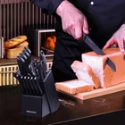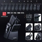 Practibility & Affordability:the Knife set with block contents: 6 Chef's Knives; 8"chef knife; 7"santoku knife; 8"slicing knife; 8"bread knife; 5"utility knife; 3.5"paring knife; 6x4.5"Steak Knife Set; Kitchen Scissors; oak wood knife block, individual sharpener, vegetable peeler, kitchen gadgets holder Cool All-Black Coating: the Knives set made of superiou quality carbon steel & storaged in a cool black knife block with individual sharpener, This Kitchen Knife Set Almost meet your all cutting needs for cooking Block Knife Set: the set of knives for kitchen is optimized with excellent flat-grinding craftmanship and polish-finish,the most advanced edging-crafts Make the knifes razor-sharp, enduring and anti-rust,Dishwasher-safe Full-Features Knives Set: Knife Sets with block for kitchen includes 12pieces of kitchen knives, which is an essential for kitchen & Almost meet all the needs for home cooks, Easy to storage and save your space Perfect Complement for Kitchen Decor: Knife Set Black with sharpener with all-black coating & cool looks, Fits for various styles of kitchen decor. Meanwhile, the black oxidation coating provide protection the kitchen knives from rusty & corresion, So make the knives set for kitchen durability & longevity Efficeint Storage & Easy Maintenance: this Kitchen Knife Set with a solid wooden block,all kitchen knives & gadgets can be housed in one, Daily Maintence is only keeping the knives clean & dry after use After-Sales Service: will provide 24-hour online service. If you have any issues, please contact us promptly; your satisfaction is our priority. Additionally, we offer product technical support