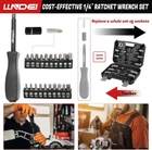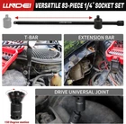 Product Description LLNDEI 83 PIECES METRIC & SAE 1/4 INCH DRIVE SOCKET SET WITH A VARIETY OF SOCKET SIZES AND OTHER ACCESSORIES, WHICH IS AN IDEAL CHOICE FOR AUTOMOTIVE REPAIRS, HOUSEHOLD MAINTENANCE, DIY PROJECTS, AND OTHER APPLICATIONS Previous page 6-POINT SOCKET DESIGN Enhances contact with fasteners, improving grip and preventing corner rounding. DURABLE CRV MATERIAL Heat-treated and with a corrosion-resistant black phosphate coating for longevity. PERMANENT MARKINGS High-contrast size markings for easy reading, improving efficiency and accuracy. UPGRADE STORAGE CASE Each socket is held more securely, and the storage clip is also more durable for long-term use. MULTIPLE ACCESSORIES Multiple tool accessories can be combined in various ways to meet your diverse needs. Next page 1 6-POINT SOCKET DESIGN 2 DURABLE CRV MATERIAL 3 PERMANENT MARKINGS 4 UPGRADE STORAGE CASE 5 MULTIPLE ACCESSORIES Note: The grease on the surface of the sockets is applied to prevent rusting 22x SAE Deep and Shallow Sockets; 28x Metric Deep and Shallow Sockets; 5x E Torx Socket; 1x 1/4" Dr. 72-teeth Ratchet Handle; 1x 1/4" Drive U-Joint; 2x Extension Bar; 1x T-Bar Adaptor; 1x Spinner Handle; 1x 1/4” Socket Adapter for Power Tools, 1x Coupler for Bit; 20x Bits; 1x Storage Case 1/4" Universal Joint Enables complete rotation of up to 150 degrees, providing access to tight spaces and hard-to-reach fasteners. 1/4" Screwdriver Bits Connects various screwdriver bits, with 20 different sizes available for versatile use in automotive, motorcycle, bicycle, home furniture, etc. 72T Quick Release Ratchet Reversible switches and ergonomic ratcheting handles, help your work be efficient and convenient even in a narrow space! Adaptor & 8" Extension Bar T-Bar is a tool that combines an adapter and an extension bar. When you lack a wrench, it can be used as a substitute for a wrench. Hot-selling Products from LLNDEI Store LLNDEI 83pcs Socket Set Add to Cart LLNDEI 95pcs Socket Set Add to Cart LLNDEI 49pcs Socket Set Add to Cart LLNDEI Magnetic NutDriver Add to Cart LLNDEI 44pcs Socket Set Add to Cart LLNDEI 38pcs Socket Set Add to Cart LLNDEI 186pcs Socket Set Add to Cart Customer Reviews 4.7 out of 5 stars 1,236 4.7 out of 5 stars 1,236 4.8 out of 5 stars 70 4.6 out of 5 stars 88 4.7 out of 5 stars 111 4.7 out of 5 stars 111 4.7 out of 5 stars 1,236 Price $53.99 $ 53 . 99 $68.99 $ 68 . 99 $69.99 $ 69 . 99 $39.99 $ 39 . 99 $42.99 $ 42 . 99 $39.99 $ 39 . 99 $124.98 $ 124 . 98 Drive 1/4"(SAE/Metric) 3/8"(SAE/Metric),1/4" 1/2"(Metric) / 1/4"(Metric) 1/4"(SAE) 1/4"&3/8"(SAE/Metric), 1/2" Material Cr-V (50BV30) Cr-V (50BV30) Cr-V (50BV30) Cr-V (50BV30) Cr-V (50BV30) Cr-V (50BV30) Cr-V (50BV30) Deep or Shallow Deep and Shallow Deep and Shallow Deep Deep (6-inch long) Deep and Shallow Deep and Shallow Deep and Shallow Blow Molded Case 11.02x 8.07x 2.83 inches 12.6 x 8.8 x 2.8 inches 12.6 x 8.9 x 2.7 inches 8.8 x 6.8 x 1.5 inches 9.4 x 5.6 x 2.2 inches 9.4 x 8.3 x 2 inches 17.7 x 13 x 3.5 inches Power Source Hand Powered Hand Powered Hand Powered Hand Powered Hand Powered Hand Powered Hand Powered On Feb 20, 2025 at 01:32:53 PST, seller added the following information: On Feb 22, 2025 at 01:55:13 PST, seller added the following information: