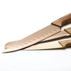 Knife Set - Luxury rose Gold kitchen Knife set, titanium coated 4 piece stainless steel hollow handle golden kitchen knife set wood grain knife Product Details Blade Material: Stainless Steel Brand: MAOMIDA Color: Rose gold wood grain Handle Material: Resin,Stainless,Stainless Steel,Steel,Wood Blade Edge: Serrated Blade Material: Stainless Steel Brand: MAOMIDA Color: Rose gold wood grain Handle Material: Resin,Stainless,Stainless Steel,Steel,Wood Blade Edge: Serrated Blade Length: 25 Centimeters Construction Type: Forged Blade Color: 轻奢金 Is Dishwasher Safe: No Item Length: 9 Inches Manufacturer: MAOMIDA Size: 13x1.18.2.76 UPC: 614161523997 Item Weight: 12 ounces Country of Origin: China Item model number: 210014 Date First Available: December 8, 2022 Stick resistant: Each blade is crafted from stainless steel and features a stick resistant, resin coating that limits food from adhering to the knife; this allows for easier, more efficient cutting Best knife set outstanding Performance The knives are single piece made, easy to hand clean and no more loose or fallen handle. Optimized weight and good balance make kitchen knives fit nicely in the palm of hand. The hollow handles are ergonomically designed to provide comfort and perfect grip. Perfect for both professional and beginner. Slice like a dream: If you think our 4-piece cutlery set is pretty, wait until you slice it with these delicate knives. These knives are made from some of the finest, highest quality materials and can be sliced and diced in any food you throw at them. Sourced from stainless steel with a spray black titanium coating, these knives for chefs and home cooks are super sharp and will keep the edge of their razor life for a long time. Skilfully designed blades with a durable stainless steel construction for effortlessly cutting Reinforced wood grain handle for comfortable grip and easy control during use. Made in China.