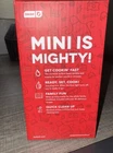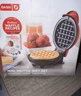 The product is a red Dash mini waffle maker gift set that includes a cookbook with over 80 recipes and measuring spoons. The waffle maker is a standard circle shape with a capacity to make 1 waffle at a time. It is a Dash model B076H1Z2WB and comes with recipes as components included.