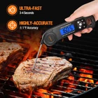 Meat Thermometer Digital, Food Thermometer Instant Read Thermometer Waterproof ULTRA-FAST & HIGHLY ACCURATE: With a precision sensor, this Digital meat thermometer reads temperature in 2 to 4 seconds and is accurate within 1 ??F . Supporting Celsius and Fahrenheit display from -58??F to 572??F (-50??C to 300??C) makes the food thermometer suitable for BBQ, grill, pan-frying, baking or candy making. EASY TO USE: The ultra-thin anti-slip grip design makes this digital grill thermometer easy to maneuver. With its retractable probe, large hang loop and built-in strong magnetic at the back, you can conveniently store the cooking thermometer in the kitchen. WATERPROOF & LARGE BACKLIGHT DISPLAY: The Candy Thermometer is IP67 Waterproof rated. Clean under running water with no concern. No-fog screen. The large 1.65 Inches backlight display gives easy reading in any dark or dim situation. AUTO-OFF: This 4.5Inches food grade stainless steel probe keeps your hands burn-free in high heat situations. 2 mins auto-off makes the BBQ thermometer a battery saver. With a Hold button, no more lingering near the heat to read the current temperature. WHAT YOU GET: The package includes a kitchen thermometer, Comprehensive food temperature guide, user manual, 2 button batteries, 1 battery opener and lifetime hassle-free customer support. Any question or problem will be addressed timely. No risk purchase!