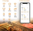 IBBQ-4T WiFi Meat Thermometer Weight: 165g/5.82oz Battery: 2000mAh built-in lithium battery Short Time Measurement Range: from 0℃ to 300℃(32℉~572℉) Continuous Monitoring Range : from 0℃ to 250℃(32℉~482℉) Temperature Accuracy : ±1℃/±1.8℉ Wireless Connection: Wi-Fi Connection. Requires 2.4GHz Wi-Fi (Support IEEE 802.11b/g/n) Compatibility: iOS 10.0 or above, Android 4.4 or above Display Type : Black-and-white LCD Dimensions of LCD Displ ay: 53mmx35mm Battery Type : rechargeable built-in lithium battery Capacity: 2000mAh/7.4Wh Adapter: 5V/1A Calibration: ±12℉ No Distance Limitations Connected with 2.4GHZ Wi-Fi. It can pair with your phone with the Inkbird Pro app even if you are at the office or Traveling. Timer & High/Low Alarm Support high and low alarms and timers. Just a glimpse at your phone to get the meat temperature when you have fun with your friends or family. USB Rechargeable Battery The 2000mAh lithium battery could last about 26 hours once fully charged. Don’t need to spend extra money on replacing batteries anymore. Accurate Temperature The calibration temperature range is -12F to 12F. The probe short time measurement ranges from 32℉~572℉), and the continuous monitoring range: from 32℉~482℉. Screen Backlight Design The LCD screen could make you clearly see the screen value in the sun or at night. PACKAGE CONTENT: 1x BBQ-4T+4 Colored Meat Probes+USB Cable Holiday & Birthday Gifts It is easy to pack./Best gift wifi meat bbq thermometer support 12 types of meat preset temperatures and different tastes recommended by USDA.