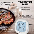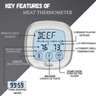 Built in Quality: Made with durable ABS material, this food thermometer ensures longevity. This meat thermometer is waterproof 304 stainless steel construction offers high-temperature resistance. Equipped with a 6.89-inch food probe and a 39-inch wire, digital thermometer for cooking provides precise measurements for monitoring the real-time temperature of boiling oil or meat in the oven. Digital kitchen thermometer timer features countdown and countup ability, up to 99 hours, 59 minutes Precision and Heat Endurance: The wireless grill thermometer and wire are capable of enduring temperatures up to 716 degrees Fahrenheit, allowing you to cook within a broad temperature range from 32 to 572 degrees Fahrenheit (0 to 300 degrees Celsius) with impressive accuracy 1-degree resolution, 1.8 degrees Fahrenheit/1 degree Celsius. Simply lift the battery cover of meat thermometer digital to use it as a stand, or utilize the magnets to attach it to a metal surface. Requires 2 AAA batteries. R esponsive Touchscreen LCD Display: Simply touch the three buttons on the screen of digital food thermometer to adjust time, temperature, switch units, or switch between modes. The large LCD display, complete with backlighting, offers a clear view and wide viewing angles, Bluetooth meat thermometer making it ideal for outdoor BBQs or grilling on the patio, even at night. With intuitive controls and excellent visibility, Wireless meat thermometer enhances your cooking experience effortlessly. Features Designed for User Convenience: In this meat thermometer you can change from Celsius to Fahrenheit, pick from 9 types of meat and 5 levels of taste, and look at the manual for the right temperature. Keep an eye on your food's temperature accurately with this touchscreen meat thermometer and easily select how well you want it cooked. Attach the oven thermometer to your kitchen appliances using its strong magnet, so it's always nearby and easy to find. Happy Customers: Chandler's Meat Thermometer is made to make customers happy. It's easy to use and can switch between Celsius and Fahrenheit. You can pick from different kinds of meat and how well you want it cooked. The manual of digital thermometer helps you know the right temperature. Just touch the screen to set how cooked you want your meat. It sticks to your kitchen stuff with a strong magnet, so it's always close by when you need it. Chandler makes cooking easy and tasty every time!