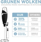 [Detachable Head Included] Our electric milk frother is a breakthrough compared to traditional milk frothers. We have developed a unique detachable design that can create multiple functions within a single device. This allows it to serve as both a frother whisk and an egg mixer. The heads are easy to change. It can be used not only to stir ordinary matcha, coffee, cocktails, hot chocolate and fruit drinks, but also to stir thicker liquids, such as milkshakes, protein powders and even eggs. [A New Generation with Stronger Power] Our electric milk coffee blender uses a new generation of technology, it has stronger power and provides a speed of 17000rpm, creating thicker foams in a few seconds. Our handheld milk frother can be used in more mixtures, suitable for all types of milk, as well as creams, soybeans, etc. Besides, the service life time of its motor is almost 3 times longer than others. Our motor can be used for over 300 hours and others can only be used for about 100 hours. [More User-friendly Design] Most of other milk frothers adopt vertical buttons. After investigation, we found that side button is more comfortable and easier to use, so we integrated it into our hand-held electric whisk. Through practical tests, it's proved that this handheld mixer can also provides 4 times longer battery life using 2 AA batteries (not included). After new batteries are installed, it can be used for over 6 hours in total, while others can only be used for around 1.5 hours. [Made of High-quality Materials] Our drink mixer is made of only high-quality materials. The handle we use is non-slip ABS material and the blender portion is made of food-grade 304 stainless steel, which is safe and green. The bracket is also made of stainless steel, which is very stable and sturdy. The electric blender is very easy to clean, you can immerse into water and it will be completely clean in just a few seconds. [Exquisite Set] Our handheld froather is equipped with a stand and an egg beater. The bracket makes it easy to store and does not take up space in your kitchen. The egg beating head is specially used for beating eggs, reducing resistance and prolonging the life of the motor. We offer a lifetime warranty; if you have any questions, please contact us and we will quickly solve it for you.