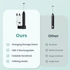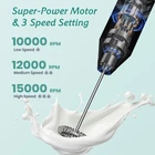 【High Speed & Fast Milk Frothing】Our electric handheld frother for coffee reaches an impressive 15,000 revolutions per minute, providing fast foam in just 15 seconds. The electric milk frother of housing is crafted from ABS material, featuring a sleek and sturdy design. Meanwhile, the mixing head is built with tough, food-grade 304 stainless steel, guaranteeing resistance to rust and breakage, all while ensuring quiet and optimal efficiency. 【Powerful USB-C Rechargeable Milk Frother 】This electric frother wand for coffee is equipped with USB-C charging with a 1200mAh lithium battery and a multi-functional storage stand, the coffee frother offers flexible and convenient charging solutions, ensuring that you can power it up anytime, anywhere. The included charging dock can also be used as a convenient storage stand, ensuring that your frother is always available. Conveniently portable, it's suitable for use at home, in the office, outdoors, or while traveling. 【Automatic self-calibrating stirring design】Our rechargeable milk frother Inspired by the racing car suspension system, our frother's mixing wand automatically corrects itself to prevent tilting and bending issues during prolonged usage. Its self-calibrating design guarantees hassle-free use and consistently creamy results, making it a must-have for any coffee enthusiast. The electric whisk has a built-in powerful low-noise motor, so you won’t disturb your family when using it. 【Foldable Frother Design】The handheld frother for coffee features an ergonomic handle that fits snugly in the hand, providing a comfortable grip during the foaming process. Engineered for improved grip and comfort, reducing hand strain during use. You can also turn the mixer counterclockwise to get a 90° folded state for even more flexibility. The electric drink mixer frother is easy to use and clean. Just put the whisk head into a cup of water and turn on the machine for a hassle-free cleaning experience. 【3 Speed Setting and 3 Replaceable Stirrers】The coffee mixer has three buttons on the main body of the mini hand mixer,3-speed adjustable options (low, medium, high).Use low speed for egg yolks and power drinks, medium speed for matcha and chocolate, and high speed for coffee,latte and cappuccino froth. The matcha frother comes with 3 premium food-grade stainless steel whisk for various uses,Spring whisk for frothing milk and coffee and making drinks;Balloon whisk for mixing eggs and cream;HOOK WHISK for mixing powders,making jam and baby food. 【Packages include】Our handheld milk frother with stand is specifically designed for coffee lovers, combining a lightweight construction with an ergonomically designed. The drink mixer package includes a hand stirrer electric, milk frother head, whisking head, mixing head, USB cable, rechargeable base. 【Reliable After-Sales】Please contact us at the first time if you have any problems using it. If you have used this product and returned it, please mark it as unsellable so that the used product will not be resold to other customers, it is much appreciated. Product Description The video showcases the product in use. The video guides you through product setup. The video compares multiple products. The video shows the product being unpacked. Upright State The agitator rotates clockwise toget a 180°vertical state. Folded State Rotate the agitator counterclockwise toget a 90° folded state. What is the capacity of the handheld milk frother's battery, the battery last on a single charge? The usb rechargeable milk frother features a built-in 1200mAh lithium battery.The battery life is typically about 4 hours on a single charge and can last up to 60 days or more. Which milk can i choose for this milk frother? Yes, this hand mixer milk frother is designed to effectively froth various types of milk, including almond and soy milk. Its powerful motor and whisk attachment create creamy and frothy textures regardless of the milk type used. Does the frother offer multiple speed settings for different frothing preferences? Yes, our powerful milk frother operates at a fixed speed of 3-speed options low(10000RPM), medium(12000RPM), high(15000RPM) and multiple speed settings. One-touch switch, no need to switch other gears at the same button. What causes the mixing head to shake? This is an auto-calibration feature of the milk frother that prevents tilting and bending issues when used for long periods of time. The swing is just right for quick mixing and fluffing, which shortens the time it takes to froth or foam milk. Is the frother easy to clean, especially considering its foldable design? The foldable design features an ergonomic handle that fits snugly in the hand,providing a comfortable grip during the foaming process.Just put the whisk head into a cup of water and turn on the machine for a hassle-free cleaning experience.