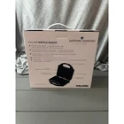 Enjoy the perfect breakfast treat with this Deluxe Waffle Maker from Kalorik. The sleek black design with a square shape is perfect for any kitchen. This electric waffle maker is coated with sapphire diamond for a non-stick surface and easy clean-up. With a power source of 120V and 750W, this waffle maker has a capacity of 2 and features an indicator light, heat-resistant handle, and easy clean components. The model number WM 46839 BD includes a recipe book, handle, instruction manual, and sapphire diamond coating. This product can expose you to chemicals including Lead which is known to the State of California to cause cancer and birth defects or other reproductive harm. Get ready to make perfect waffles every morning with this Kalorik waffle maker.