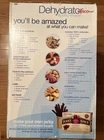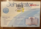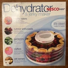 Nesco American Harvest Food and Jerky Dehydrator. Dehydrates all kinds of things, from food to meat, fruit, vegetables, croutons, trail mix, jerky and more, it can even be used for crafts, to dry flowers, dough and potpourri. Can be used for pet treats, like liver, biscuits, crackers and jerky. 4 round clear trays with base you can get more trays as it will hold up to 7, but you get four in this box. 500 watts for quick dry times, (drys in hours, not days) dishwasher safe, fixed temperature, simply plug in and it sets itself to dry whatever is inside. Fan Flow Radial Air means you don't need to rotate trays. CONDITION: New in box, never used.