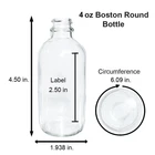 Precise dispensing is what you get when you use this 4 oz. Clear Boston round with black dropper When just a few drops is all that's needed to get the job done, this 4 oz. clear Boston round glass bottle with black glass dropper is the perfect choice. The glass dropper makes it possible to dispense very small quantities to reduce waste and ensure precise dosing or application. Stylishly designed with its easy-to-twist black cap, this glass bottle is perfect for professional packaging, as well as homemade product storage and dispensing. Black glass dropper ensures precise application or dispensing Textured cap makes for easy opening and tightly closing. Great for storing and dispensing massage oils, essential oils, tinctures, herbal remedies and much more. Clear glass bottle allows you to identify the contents and looks great with any label. Capacity to hold up to 4 ounces.